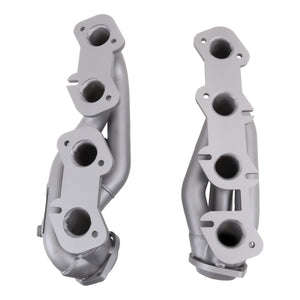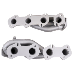 These BBK Performance shorty tuned Length exhaust Headers are designed and constructed as direct fit replacements for all 97-03 Ford 4.6L F150 truck And Expedition applications. Each header is manufactured with 1-5/8 in. CNC mandrel bent tubing that offers unrestricted exhaust flow for increased horsepower and torque over factory OEM manifolds. BBK tuned Length headers offer improved scavenging waves for better combustion, which leads to improved performance and fuel economy over stock or equal Length headers. As with all BBK Performance exhaust headers they feature a 3/8 in. laser cut flange for additional strength and a guaranteed leak free fit. All headers are robotically and precision hand welded and then pressure tested to ensure years of reliability and performance in the real world. All BBK exhaust headers are available in a Titanium Ceramic or polished silver ceramic coated finish and include new exhaust header gaskets, header bolts and hardware to complete the installation. 50 State Legal CARB Approved