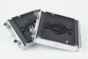The High-Performance All-Aluminum Auxiliary Radiators work in conjunction with the rest of the cooling system to reduce temperatures throughout. This is critical as the Auxiliary Radiators not only help keep engine water temperatures lower, but also are utilized as the heat exchange medium in the air-to-water charge-air coolers for the turbocharger system to reduce intake air temperatures (IATs). Overall, the Auxiliary Radiators larger capacity prolongs the heat soak threshold and assists in keeping temperatures in optimal ranges. The included, detachable rock guard offers protection against the build-up of debris, as well as possible core punctures - unlike the OEM auxiliary radiators, which have little protection against the elements. CSF recommends purchasing two Auxiliary Radiators to replace both left and right OEM units (for vehicles with two from the factory). For maximum cooling performance, we advise installing in conjunction with the Front Mount Heat Exchanger (CSF #8088).
