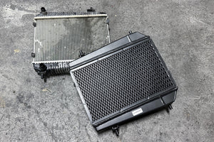 Compared to the OEM G8X coolers, the CSF units are a significant upgrade. The TIG welded aluminum tanks are much larger than the OE plastic tanks offering superior strength and fluid volume. A larger 2-row 42mm core increases cooling efficiency and capacity. This high efficiency core uses CSF's Exclusive B-Tube Technology and latest 5mm fin technology, maximizing airflow and heat dissipation. These 5mm fins significantly increase the heat exchange surface area improving overall cooling efficiency and recovery while still maintaining good airflow.
