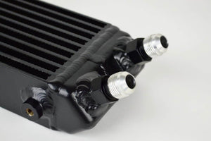 The unique design of CSF's oil cooler line has distinct advantages over conventional style oil coolers (plate-type/stacked oil coolers). The oil coolers can be placed in tighter spaces or different areas of the vehicle that don't have much vertical surface area. Longer rectangular sizes can also help with avoiding the stacking of too many coolers which may cause airflow issues to other components in the cooling system. Inlet/outlet port placement is much easier to route oil lines. Typical oil cooler lines have to be routed from different/opposite ends of the cooler often facing up or down. Usually one line has to run across from one side of the cooler to the other to then be routed together to the feed/return connection of the oil system. The CSF oil coolers are much more robust, durable, and can withstand a higher peak burst rate. This allows the cooler to be mounted in areas that might get high debris (front fascia, diff cooler, side vents, etc...). The CSF oil cooler is designed to withstand a tremendous amount of vibration and debris.