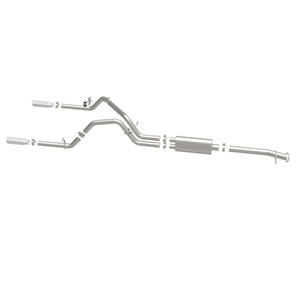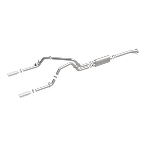 The MagnaFlow Street Series Cat-Back Performance Exhaust System 19019 brings out the personality of your Truck with our signature resonant, powerful engine tone and dyno-proven performance. Thanks to its fast-flowing, mandrel bent 3in. main piping and 1 Straight-Through mufflers ending in a Dual Split Rear exit with 3.5in. Polished Clamp-On Double Wall Angle Cut Rolled Edge tips, this Truck exhaust kit has the performance chops to match its sporty sound and appearance. Upgrade your ride to the next level with an exhaust that has the pipes to put other Truck's to shame. With this system your vehicle will be producing Aggressive exterior and Moderate interior sound levels while leaving other cars and trucks feeling envious at every stoplight. Exhaust kit 19019 features a cat-back layout that replaces your ride's stock exhaust components from near the catalytic converter on back. Extensive 3D scanning during development has resulted in a direct-fit design that you can easily install yourself. 19019 is produced using CNC precision robotic manufacturing techniques and is backed by MagnaFlow's 1-year limited finish warranty and limited lifetime construction warranty.