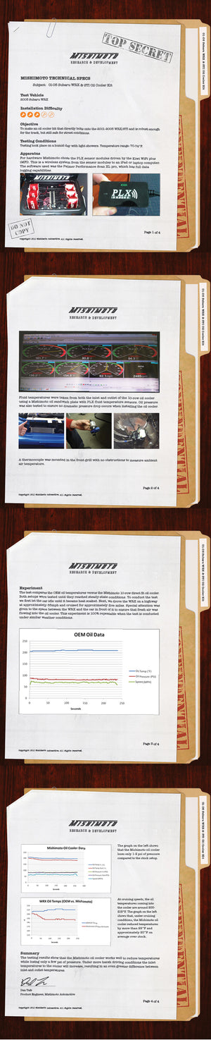 Mishimoto proudly announces the all-new 2001-05 Subaru WRX/STi Oil Cooler KIt'specially designed for your Subaru WRX and STi, the Mishimoto oil cooler is a direct fit and can be installed in just two hours! Mounted in the front grille for optimal airflow, the Mishimoto Subaru WRX/STi oil cooler kit drops temperatures over 20 degrees.You can be sure that this kit is perfect for keeping your Subaru WRX or STi cool under any driving conditions.The Mishimoto 2001-2005 Subaru WRX/STi Oil Cooler Kit comes with a Lifetime Warranty, so you know quality is guaranteed! Available with either silver or a stealth black cooler this kit is perfect for your street or track Subaru!