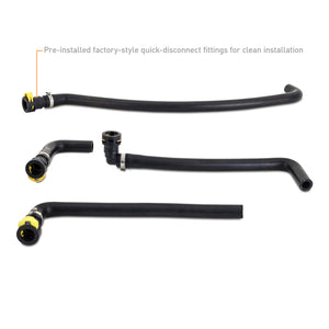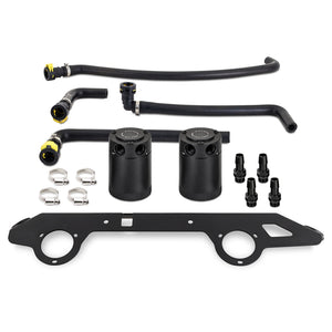 In 2023, Ford's ECM changed crankcase pressure monitoring. We redesigned to meet factory specs. The 2.7L EcoBoost has been powering Fords for nearly a decade and has become one of the most respected truck engines available. The second generation 2.7L features both port and direct injection for efficiency throughout the RPM range. While the added port injection helps clean the intake valves, it doesn't protect the rest of your engine from the effects of blow-by. As blow-by flows through your intake, it coats components like sensors and your intercooler in a sludge of oil, carbon, and fuel, reducing their ability to function. Blow-by can also reduce the effectiveness of your engine oil. The factory air-oil-separator drains blow-by back into the oil pan, which is great for the environment, but the fuel and water in blow-by can thin your engine oil and reduce its viscosity.-- Finally, any blow-by that does make its way back into the cylinder can reduce the octane of your fuel and, for a high-strung turbocharged engine like the 2.7L EcoBoost, lower octane means less power. The solution to all those issues is to capture the blow-by and keep it out of the engine with a Mishimoto catch can system. Our direct-fit baffled oil catch can system for the 2023+ Ford Bronco 2.7L EcoBoost intercepts blow-by before it enters the intake and captures it to be recycled at your next oil change. This dual catch can system provides efficient oil/water separation for both the PCV and CCV systems on your Bronco.  Our catch cans feature an internal baffle and air turbulators that help condense oil, fuel, and water vapor from the blow-by, as well as a low-restriction composite filter that captures carbon particles. Our catch can system features a sturdy 2.5mm-thick steel bracket and molded hoses which include Ford-specific quick-disconnect fittings for an easy and clean install. This catch can system is backed by our Mishimoto Lifetime Warranty for a lifetime of clean running.