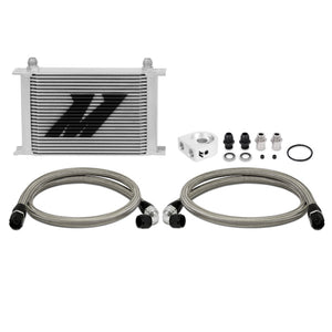 Proper oil temperature regulation is key to extending and preserving the life of your stock or high performance engine.Keep your temperatures in check with the 25-Row Mishimoto Universal Oil Cooler Kit.This kit is applicable for most vehicles and includes all key components for reducing oil temperatures and providing your engine with extra protection against oil degradation.This kit includes a billet anodized aluminum sandwich plate in either standard or thermostatic form.The optional Mishimoto Thermostatic Sandwich Plate provides additional temperature control and will limit oil flow to the cooler until optimal temperatures are reached, making it ideal for those in cooler climates.The included core is our proven Mishimoto 25-row stacked-plate cooler which can withstand high fluid pressures and significantly reduce oil temperatures while exhibiting minimal pressure loss.This kit includes both a 3/4-16 and M20-1.5 sandwich plate adapter which supports fitment for most makes and models.This kit also includes pre-assembled stainless steel braided oil lines with -10AN fittings and dowty seals for durable, leak free connections.Whether you are piloting a boosted rotary or a blown small block, the Mishimoto Universal Oil Cooler Kit will provide the efficiency you need to stay on the track and out of the shop.As with all our products this kit includes the Mishimoto Limited Lifetime Warranty.