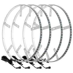 NEW! Double the LEDs. Double the Brightness! Are you looking for the brightest and most attention-grabbing LED wheel ring kit on the market? Look no further than the all-new Double-Wide LED Wheel Ring Kit from ORACLE Lighting! With over 600 LEDs these rings make a powerful impact on any vehicle! The all-new design features Plug and Play waterproof connectors for easy installations. Each ring has over 12" of insulated cable that connects to a wiring hub which makes installation easier than ever. The rings now include (5) mounting brackets per ring and have tapped fittings to easily move and adjust brackets to fit any application. The ring diameter has been increased to 16.5" to fit oversized performance brake systems. ORACLE Lighting illuminated LED wheel rings are an easy and effective way to light up your truck's wheels and suspension! This head-turning lighting product consists of a set of (4) LED illuminated aluminum rings which install around the brake rotor and attaches to the brake dust shield. These can also be mounted to older vehicles with drum brakes. The effect is a large ring of light which accents custom wheels and stands out at events. Oversized 16.5" diameter is the largest on the market and fits oversized brakes. Each ring is equipped with 162 super-bright 2835 LEDs (648 LEDs total) which will outshine any competitors.