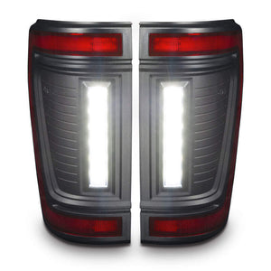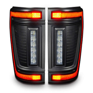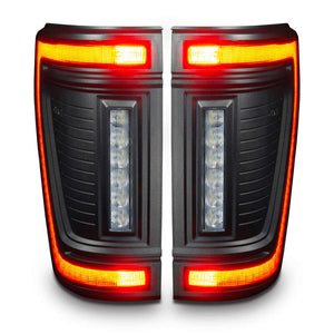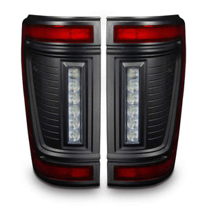 Protruding out significantly less than the factory tail lights, this low-profile design has a more streamlined appearance while also reducing the risk of tail light damage. These flush tail lights feature a unique modular design and functional LED lighting elements including high-powered reverse lights, unique signature perimeter lighting, and an animated turn signal sequence. No more problems backing up at night and no longer do you need to install additional reversing lamps onto the back of your truck to get the brightness you desire. That's because these LED reverse lights are basically a pair of LED light bars mounted into the tail light which will provide over 4,400 Lumens of rear-facing illumination! In addition to the attractive ?signature style LED lighting band and the high-output reverse light this design also features a ?dynamic turn signal effect. This ?motion or ?sequential effect is a fluid LED motion from the inside portion of the light to the outside portion of the light signifying the direction of the turn signal with a fluid animated LED sequence. These lights include wiring adapters which make them compatible with all F-150 models from 2021-2024 with or without the factory LED Option (halogen lights) and with or without the factory BLIS cross-traffic sensors. The adapters provide a true plug-and-play option without any other wiring being needed for installation. The factory cross-traffic sensors can be easily swapped over into these new lights with the original factory hardware and using our plug-and-play connectors. The new modular design allows the light to be quickly disassembled for custom painting. The Reverse Light module and Stop/Tail/Turn module can be easily removed from the black housing which can then be painted to match the body color of the vehicle to provide a more customized appearance that more seamlessly blends with the truck.