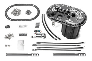 Drop-in surge tank system for competition fuel cells. Designed for Walbro F90000-series pumps. One lift pump and two primary pumps included. Easily serviceable with new lift-out fuel pump modules.