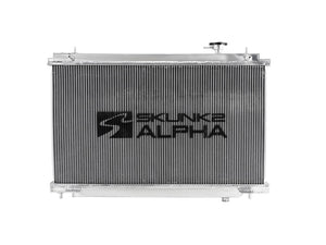Skunk2's all-aluminum, full-size Alpha Series Radiator for the '03-'06 350z is a direct-fit upgrade designed to dramatically increase both cooling efficiency and engine performance. Alpha Series Radiators are manufactured from lightweight and durable aluminum, feature 100-percent brazed cores, and include polished end tanks with Skunk2's signature Alpha logo embossed along each side. Each Alpha Series Radiator features a dual-core design, high-efficiency fins for maximum cooling capabilities. Each Alpha Series Radiator also includes provisions for the OEM cooling fan and OEM-compatible, 1.50- in. inlets and outlets.  Skunk2's commitment to producing high-quality components means that each Alpha Series Radiator meets or exceeds original equipment manufacturer standards, that each radiator may be installed without modification to the vehicle, and is compatible with OEM hoses, cooling fans, and shrouds. (Note: Some engine swap applications may require custom radiator hoses and/or cooling fans.) Skunk2's Alpha Series Radiators are the perfect addition to any high-performance vehicle and are designed for the street, the track, or even OEM replacement purposes. Alpha Series Radiators are built to withstand harsh elements as well as against years of under-hood heat cycling. Each Alpha Series Radiator adheres to strict quality control standards and careful packaging, resulting in tubes and fins capable of optimal flow and efficient heat transfer.