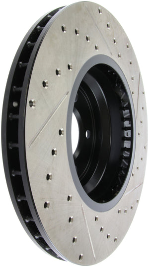 StopTech Drilled and Slotted Sport Rotors are 1-piece direct replacement brake discs for factory brake systems and stock calipers that look great behind your wheels – and offer significantly improved braking performance. The unique cross-drilling and slotting aids with heat and brake dust dispersal; prevents glazing of the pads; adds bite and improves wet and dry braking performance. Built to last; the black e-coating provides protection from corrosion and the high carbon metallurgy (in most applications) offers quieter operation; better crack resistance and increased performance.