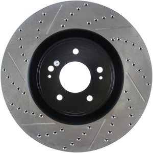 StopTech Drilled and Slotted Sport Rotors are 1-piece direct replacement brake discs for factory brake systems and stock calipers that look great behind your wheels – and offer significantly improved braking performance. The unique cross-drilling and slotting aids with heat and brake dust dispersal; prevents glazing of the pads; adds bite and improves wet and dry braking performance. Built to last; the black e-coating provides protection from corrosion and the high carbon metallurgy (in most applications) offers quieter operation; better crack resistance and increased performance.